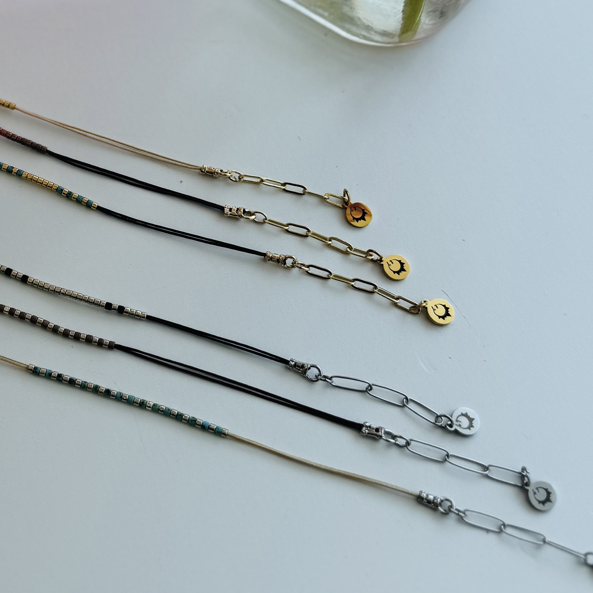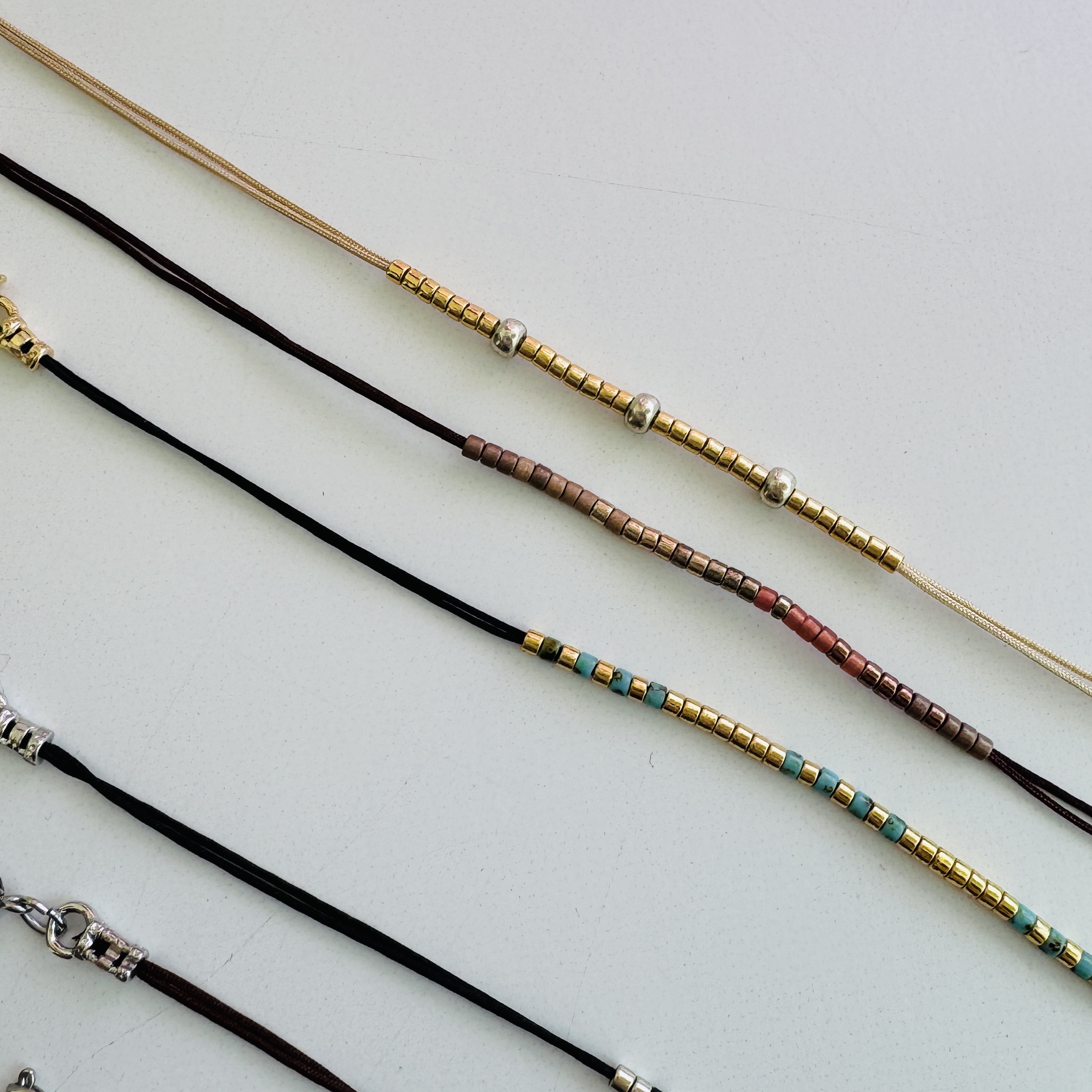 Super thin nylon cords. Japanese glass beads, 18k gold-plated and 14k gold-filled findings. Adjustable from 6-7.5″ .