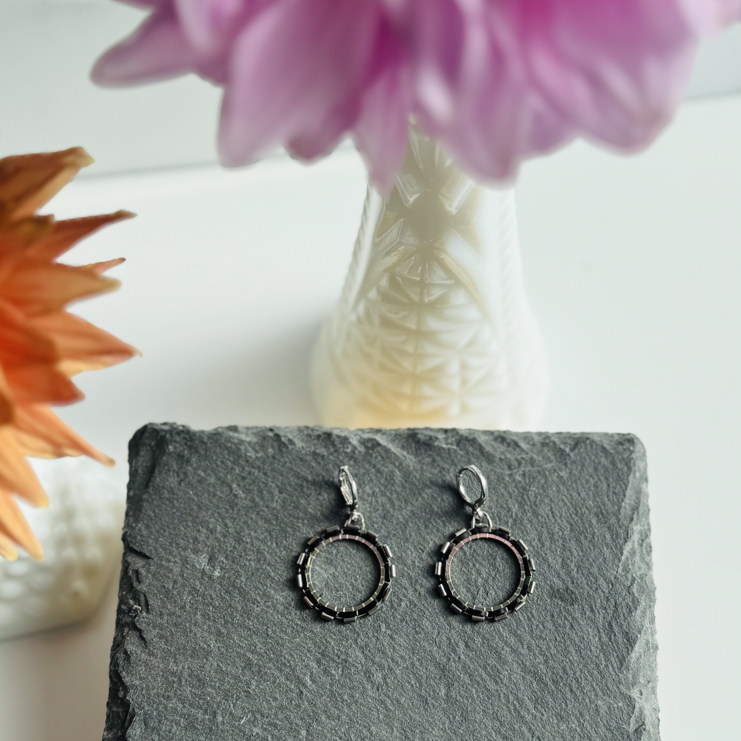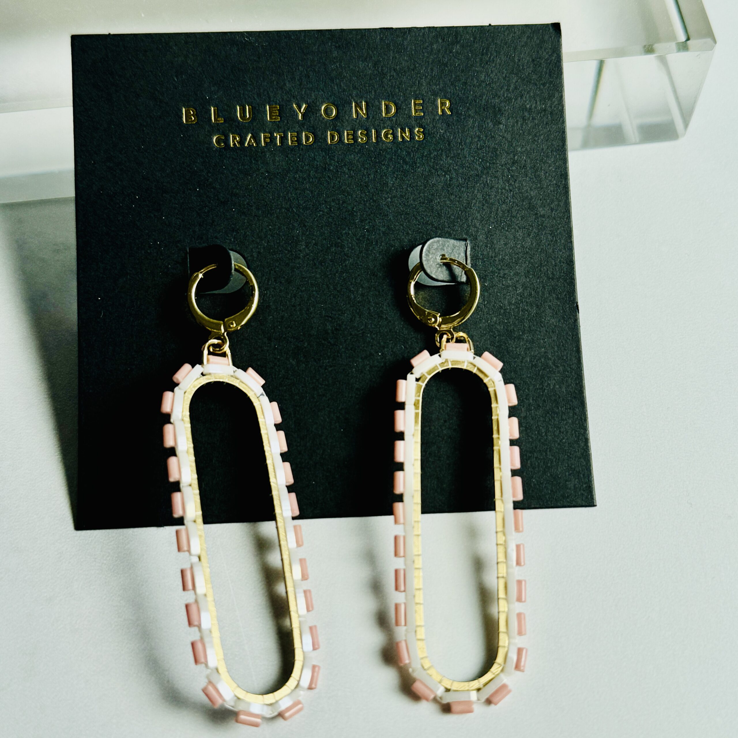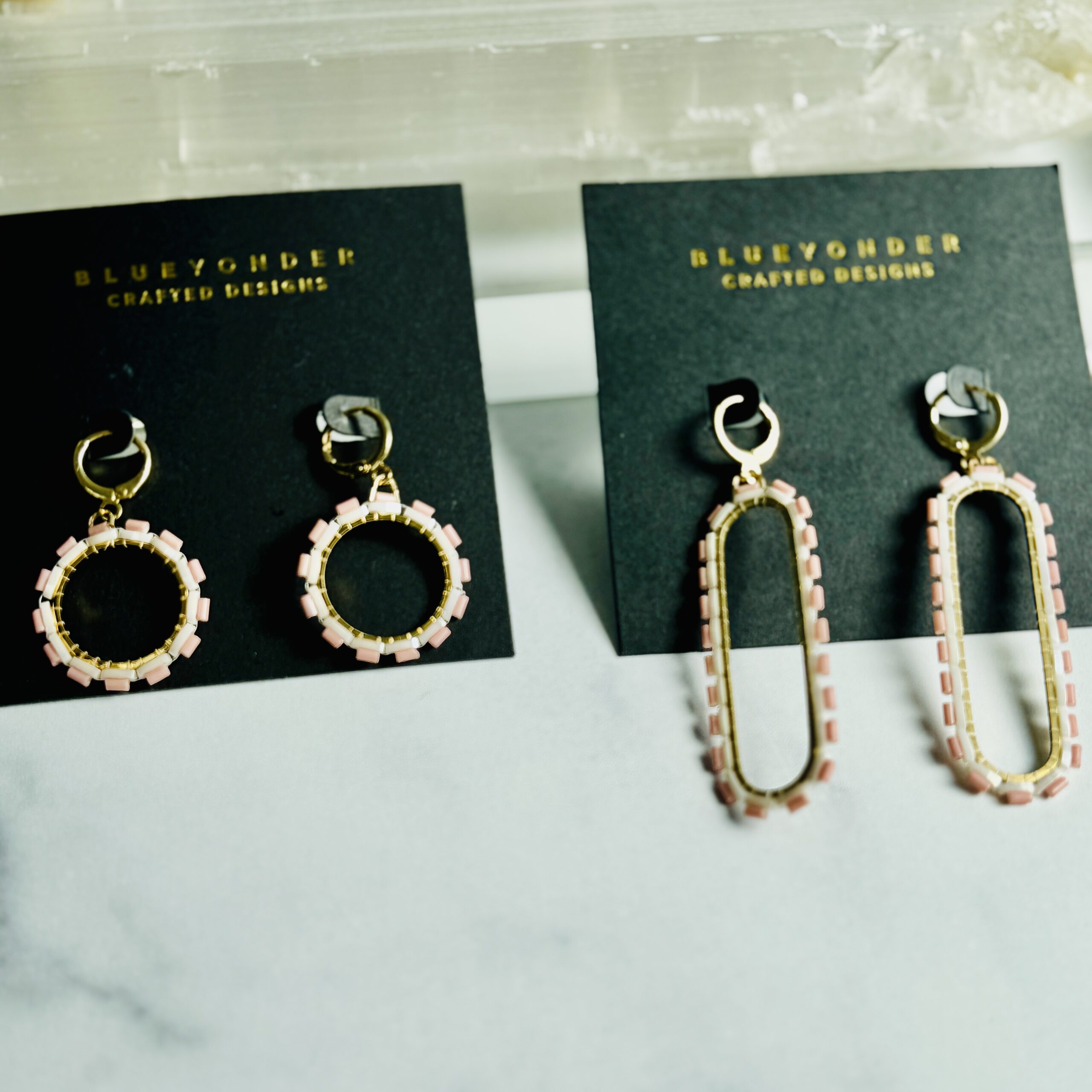 More new geometric styles for this season! Made with Japanese glass beads, brass or stainless frames, and either 18k gold- or white gold-plated earrings.