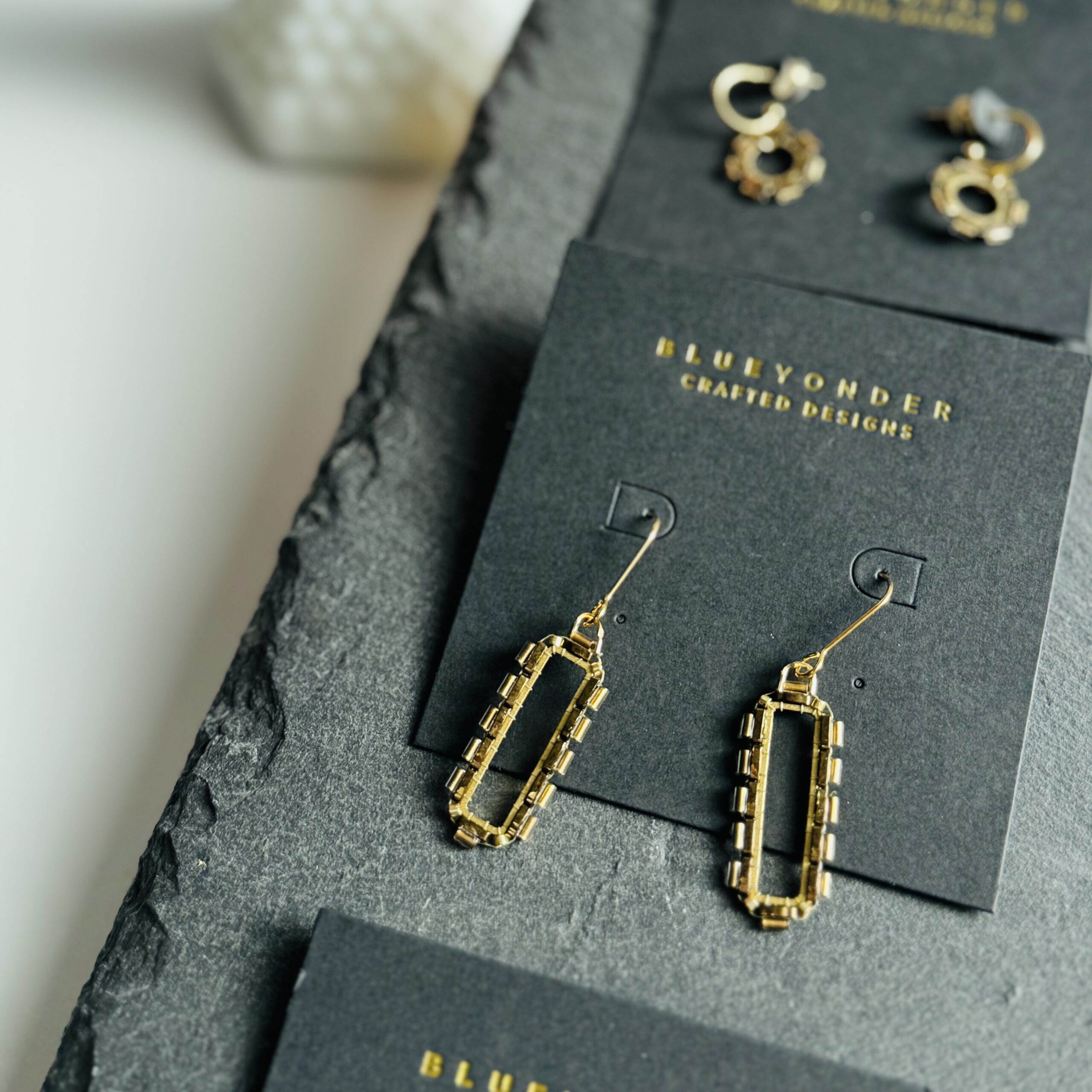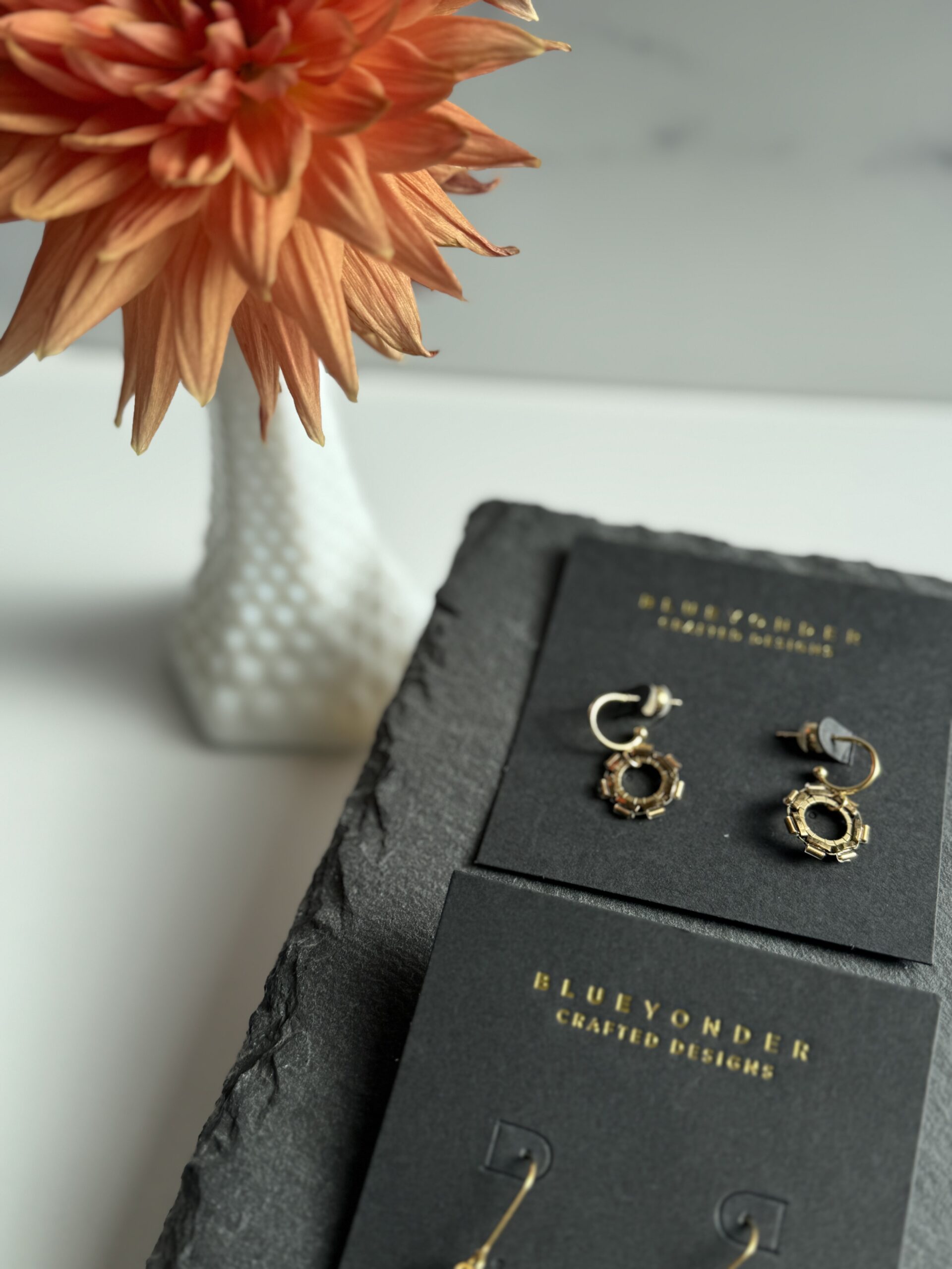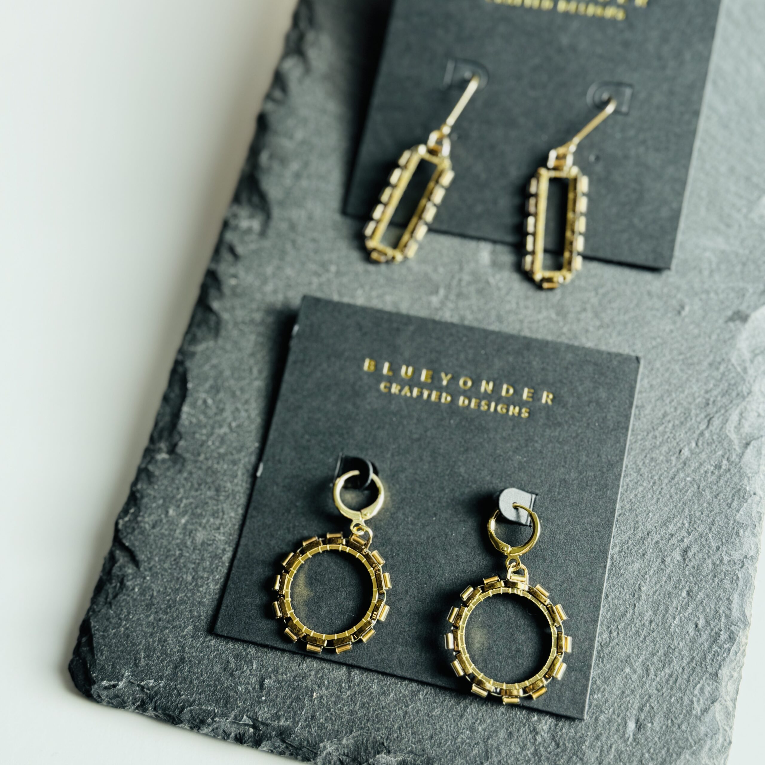 More new geometric styles for this season! Made with Japanese glass beads, brass or stainless frames, and either 18k gold- or white gold-plated earrings.