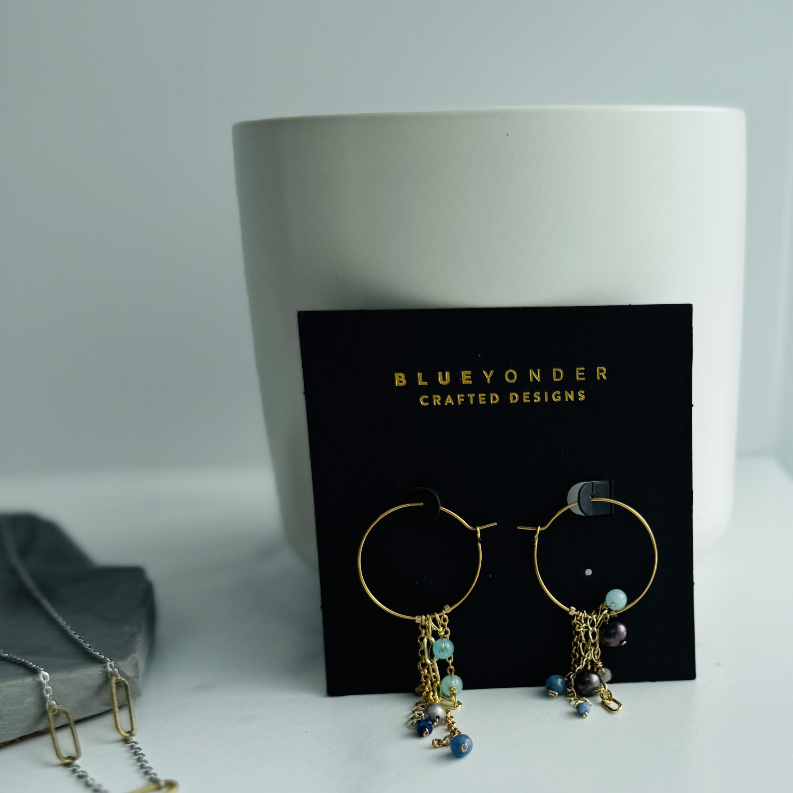 Mixed gemstones and 18k gold-plated chains adorn these 18k gold-plated hoops. Varying sizes and all one-of-a-kind.