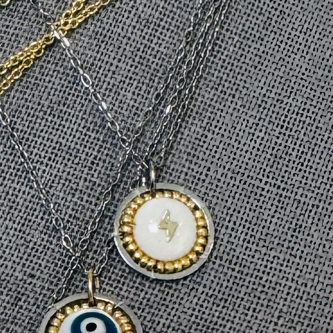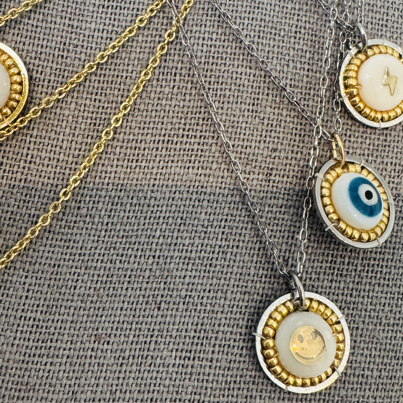Cute Mother-of-Pear beaded charms suspend from a thin cable chain necklaces measuring 16″. These charms are fabricated using tiny Japanese glass beads and metal frames. They are available in stainless or 18k gold-plated and in a variety of whimsical center motifs.